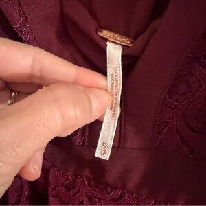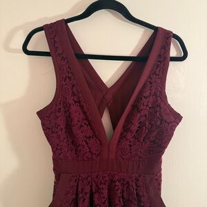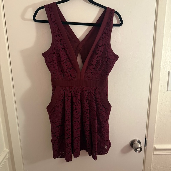 This elegant burgundy lace dress is perfect for any occasion. Its intricate lace design adds a touch of sophistication. Ideal for evening events or a night out. Women's extra small. Measures 16" pit to pit and 31" long. Made by Free People. Beautiful sleeveless lace burgundy plum color. Has pockets. In excellent preowned condition.