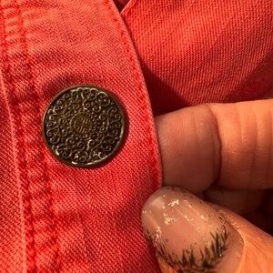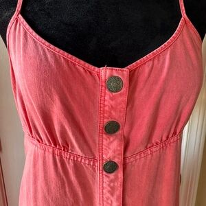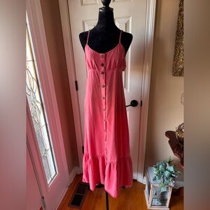 This elegant coral pink maxi dress by Free People is perfect for any occasion. Its flowing design and vibrant color make it a standout piece in your wardrobe. Features a full front snap closure, open back with a flattering overlay, adjustable spaghetti straps and 14” ruffled hem.