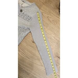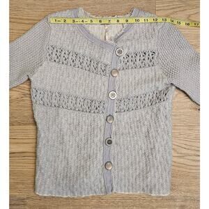 Chic gray cardigan with asymmetrical button front and textured knit design. Perfect for cozy, stylish layering.