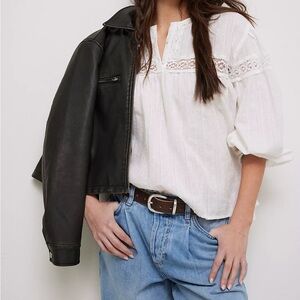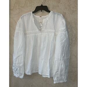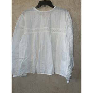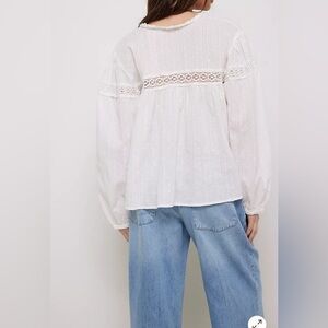 Henley-style button-up neckline, eyelet cutwork throughout, embroidered lace trimming, banded sleeves