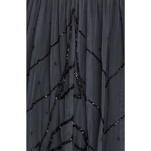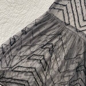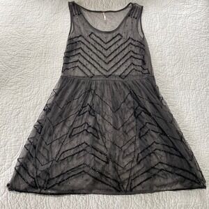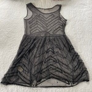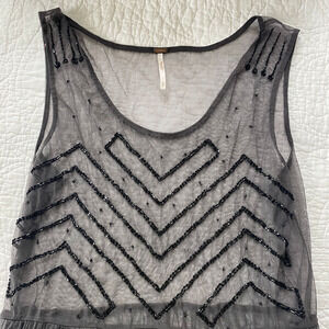 Free People mesh tulle mini slip beaded dress in a black/dark slate color. This is a rare color for this dress. Embellished with polished beads laid out in an elaborate pattern giving a lot of interest to this sheer mesh dress. Scooped neckline. Fit and flare silhouette. Unlined. 100% nylon. Size Small.