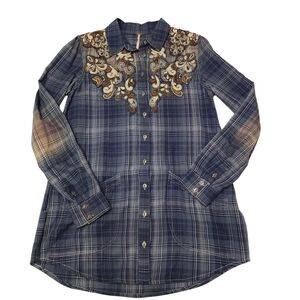 Free People Embellished Blue Plaid Buttondown Tunic Top S