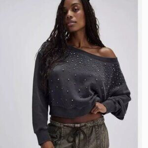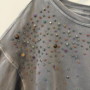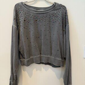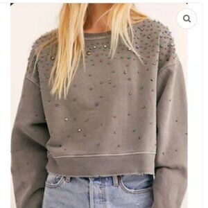 Free People Embellished Cool Rider Pullover, gray, size large. Slightly cropped with intentional distressing/fading. Some of the rhinestones have come off or are loose.
