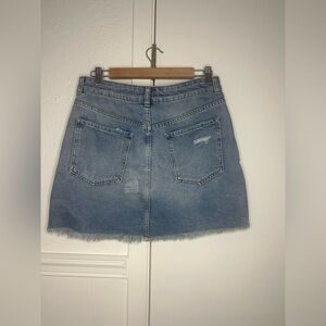 Excellent condition chic light blue denim mini skirt. Featuring a unique frayed hem and eye-catching side detailing. 100% cotton
