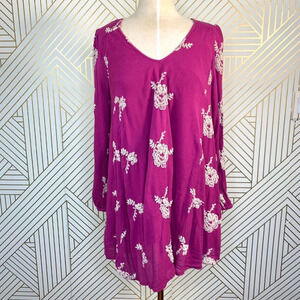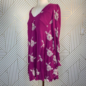 Free People Embroidered Austin Mini Dress in Purple. Flowy swing dress with beautiful floral embroidered design. Elastic band at bust and cuffs. Deep "V" in back. Side slant hip pockets. Lined.