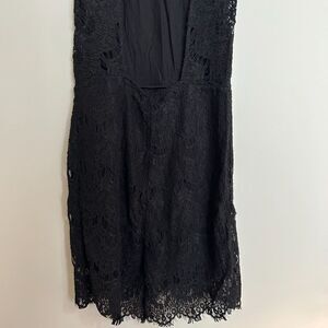 Details: Beautiful Free People backless Daydream dress. Dress secures at back neckline. Sweetheart neckline in front. Lined. Curved hem. The Free People daydream lace bodycon slip dress in black with a high neck and scalloped trim. Frayed cap sleeves and an open cutout in back. Lining features a sweetheart neckline