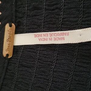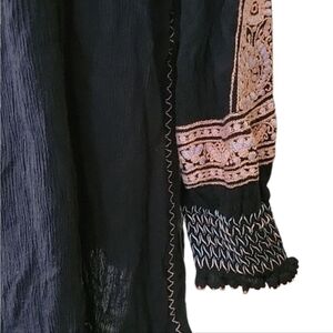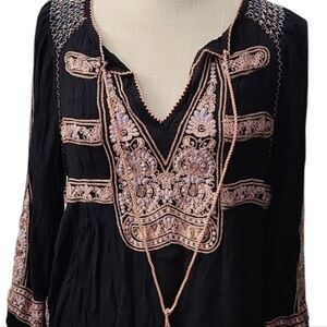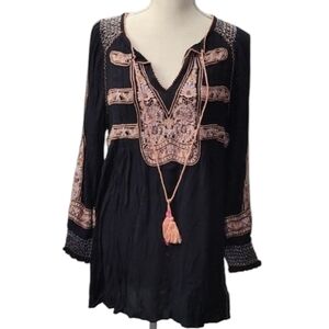 Free People elegant women's top featuring intricate embroidery in black and pink. Perfect for adding a touch of sophistication to your wardrobe. Size small. Smoke free home.