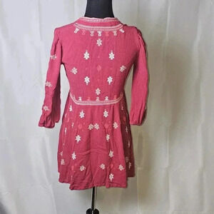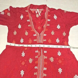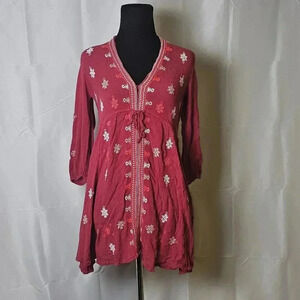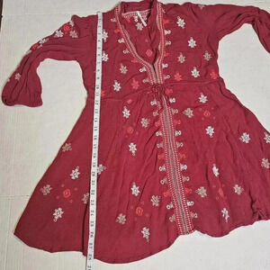 This beautiful mini dress by Free People is a must-have for any bohemian-inspired wardrobe. Featuring a geometric pattern and embroidered accents, this dress is both stylish and lightweight, making it perfect for summer, fall, and spring. The drawstring waist adds a touch of elegance and convenience, while the 3/4 puff sleeves and red color give it a playful and fun vibe.