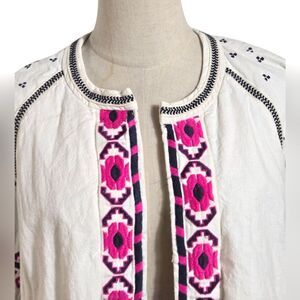 This is so pretty. Embroidered front and sleeves. Fully lined with no closure. Perfect accent piece for jeans and a tank. Good overall condition. Spring or fall