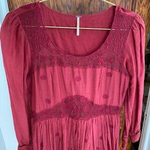 This is an embroidered dress from Free People in a lovely shade of red. It has a slightly high-low hemline, and the lace at the midriff is slightly see-through. A really beautiful garment! Comes from a pet-free, smoke-free home.