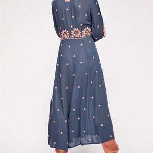 Floral embroidered maxi dress with "V"-neckline in front and empire waist.