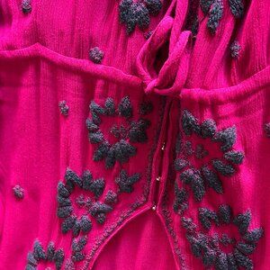 Floral embroidered maxi dress with "V"-neckline in front and empire waist.