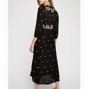 Floral embroidered maxi dress with "V"-neckline in front and empire waist.