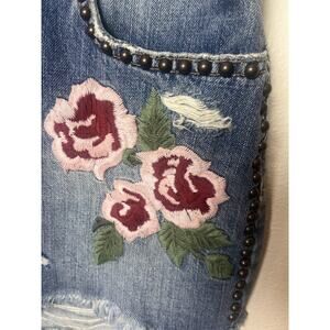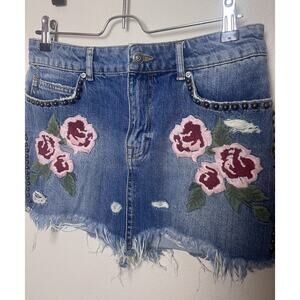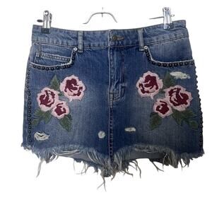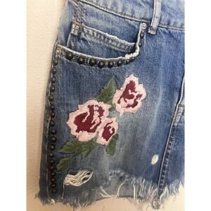 Free People Embroidered Floral Studded Distressed Denim Mini Skirt Size 26 Wild Rose