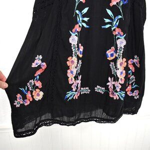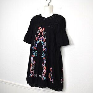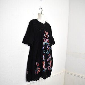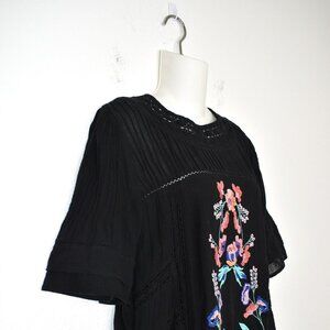 Pre-owned, good condition. No visible holes or stains. Normal signs of wash and wear including minor fading and some loose threads at neckline. Free People Perfectly Victorian Dress. Gorgeous floral embroidery in shades of pink, orange, purple, green and blue over a black background. Babydoll style. Round neckline with pleating. Button closure in back with keyhole opening. Short bell sleeves. Cotton lace accents. Slightly oversized. Fully lined. Super cute! Sold out at Revolve! Size per tag: S (Small). Fabric: 100% Cotton. Made in India. Style# OB396813. Size per tag does not guarantee desired fit, please see pictures for measurements.