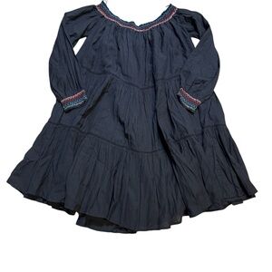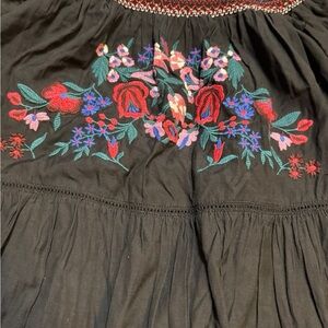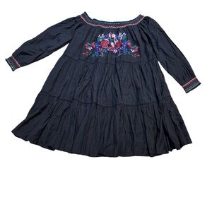 Boho-chic Free People embroidered off-shoulder mini dress/top in classic black with colorful floral embroidery at the front. Features long sleeves, tiered flowy silhouette, and versatile styling as a mini dress or tunic top. Size XS, in very good used condition—perfect for festivals, casual outings, or layered looks.