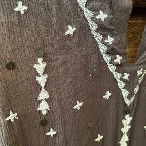 Free People embroidered mini-romper. Light and airy construction designed for all day comfort. Intricate embroidery and flared shorts.