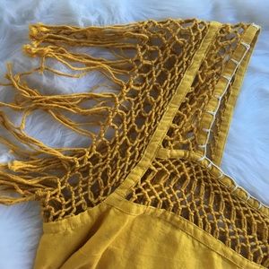 Adorable embroidered shift dress with crochet detail by Free People. Beautiful condition! Length from shoulder 34 3/4". Bust 38” waist 36”. Color is mustard/gold with white floral embroidery. Check out my bundle discount to save on shipping!