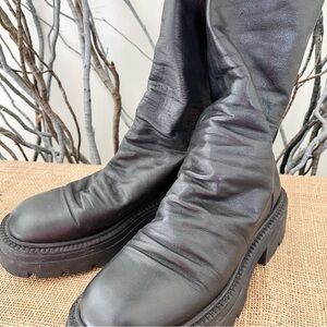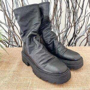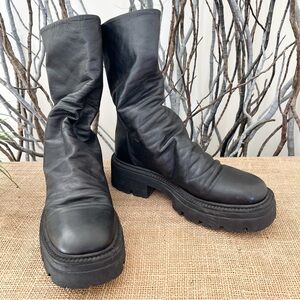 Free People Black Emma Ruche Leather Platform Boots. Features a relaxed shaft, zipper back, rubber lug sole, leather lined.