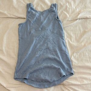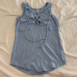 This Emmy Lou tank by Free People features a flattering lace-up front, racerback cut, and ribbed stretch knit. The light periwinkle-blue shade is soft and versatile—perfect for layering or wearing alone. Size S fits true. It's in excellent used condition with no visible wear.