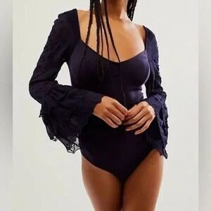 Free People Enchanted By You Bodysuit Womens Medium Navy Ruffle Sleeve V Neck