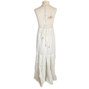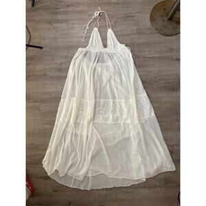 Gauzy cotton voile maxi dress with triangle upper bodice and halter neck ties. Ties at back with drawstring pulls, as well. Dotted mesh detailing around middle of skirt portion. Hi-low hem. Size medium. Excellent condition.
