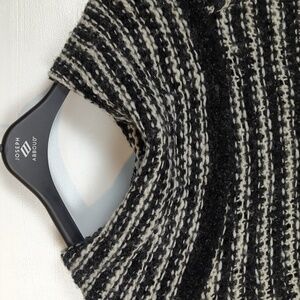 Black and white. Open knit. Long sleeves. Can be worn as a cowl neck, slightly off the shoulder, or an asymmetrical neckline. Excellent condition -- some pilling, but no stains, holes, or fraying. Laid flat pit-to-pit: 22in. Shoulder to hem: 29in.