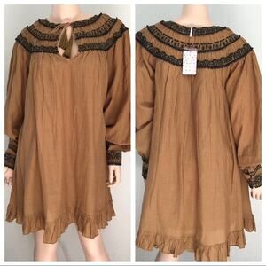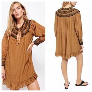 Free People Erin Embroidered Boho Mini Dress Size M NWT Long sleeve In Brown