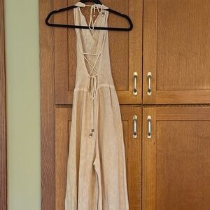 FP Beach collection features a draped, cowl neck silhouette with halter tie-back and drawstring waist