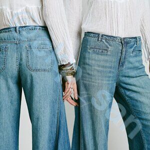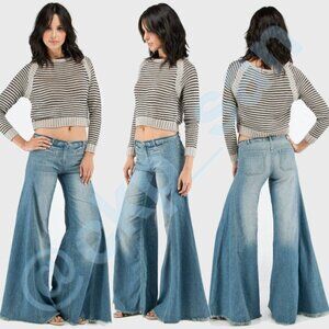 Free People Extreme Vintage Flare jeans in "Easy Rider Wash" in size 30. Mid rise fit jeans with an over-exaggerated bell bottom, slit front pockets and back patch pockets, colored seam detailing in front and back, button & zip fly. Excellent condition. 100% Cotton, so no stretch, very soft flowy light weight fabric. Please look at all pictures for details & measurements as part of the description. Color is more like stock photos, looks lighter in my pictures. Please see pictures for all for details, fabric content, condition & measurements. Sold out in stores for years and highly sought after. The larger sizes are much harder to find. Not in a hurry to sell, I might just keep them. My prices reflect the rarity of my items and what I paid for them. Reasonable offers welcome.
