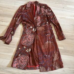 Stylish rust coat with intricate patterns. Long sleeves. Perfect for layering.