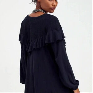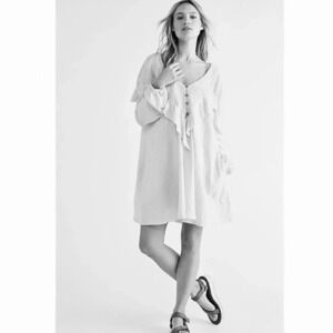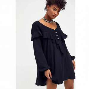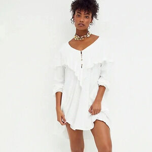 An effortless seaside staple, this mini from our FP Beach collection features a V-neck style smocked bust with button-up detailing and ruffle trim with balloon-style sleeves in a classic, straight silhouette.