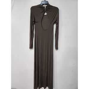 The brown dress is a size S and has a dress length that falls below the knee. The maxi dress has an A-line style, making it perfect for a day at the beach. The dress also features a cut-out design on the shoulders, adding a touch of elegance to the casual wear. It is suitable for summer, fall, and spring seasons.