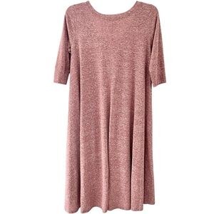 Marled jersey knit oversized high-low tee. Button detailing at front of neckline. Rounded neckline and three-quarter length formfitting sleeves. This dress is a comfy and casual essential that can be dressed up or down in a cinch.