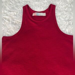 • This is a red, sleeveless, ribbed, mini dress from Free People's “Beach" line. It is a swingy, trapeze style dress with a high neckline and racerback design. It is made from a semi-sheer material.