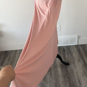 This stunning pink gown by Free People features asymmetrical design and a deep V-line neck which is perfect for a wedding guest or cocktail event, nice dinner by beach, and more! The short sleeves and gathered from chest to legs add a touch of elegance, while the flowing skirt creates a graceful silhouette. The trendy powder pink color; its romantic and sophisticated appeal. Asymmetrical dresses can enhance the body's curves by creating vertical lines, which can give an elongating effect.