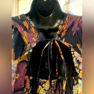 Form fitting and comfortable - this bodysuit check all of the boxes. The printed bodysuit is designed to add a bold touch to your wardrobe with a deep V-neckline and eye-catching balloon sleeves. It features a relaxed fit through the body, along with a thong bottom for a seamless look. The smocked back with an adjustable tie enhances the fit, making it both flattering and stylish. Made from 100% polyester for the printed section and 95% polyamide and 5% elastane for the knit bottom, this bodysuit blends style and comfort effortlessly. Hand wash cold to maintain its quality. NWT Smoke free home.