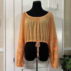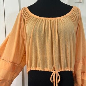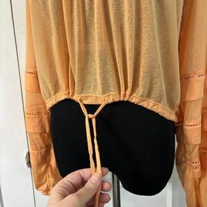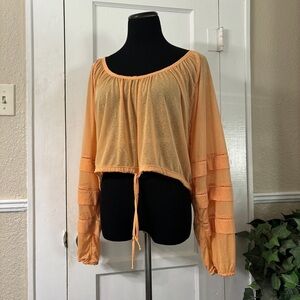 Faded Coral, workout wardrobe, semi-sheer, long-sleeve layer features a blousy design that has adjustable ties at bottom hemline. Voluminous sleeves, ladder detailing.