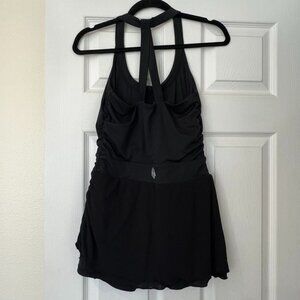 - Features: Soft, smooth fabrication; four-way stretch; breathable; built-in shorts with quick-dry interior gusset; double-lined front panel to prevent sheerness; strappy back detail; shirring at side body; loose layered ruffles at hem