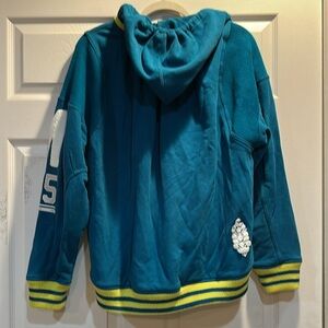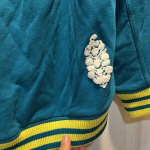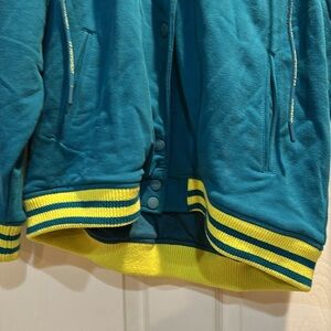 Like new FP Movement Post Up Varsity Sweatshirt Jacket Hoodie women’s size small. Teal sweatshirt fleece material- heavy weight fleece, removeable hood, long sleeves- FP movement appliqué logo down sleeve, snap buttons up front, front hand warmer pockets, lime green and teal sweater knit cuffs, sweater knit inserts on shoulders, FP logo on back. Oversized fit. Offers accepted!