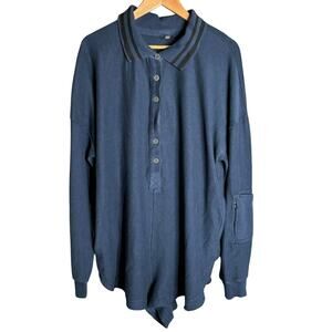 Free People Fp Movement Teach Me Romper in Navy Blue. Size XL / Extra Large. Features collar, long sleeve with pocket, dropped shoulders, and front button closure,. 100% Cotton. Missing one button.
