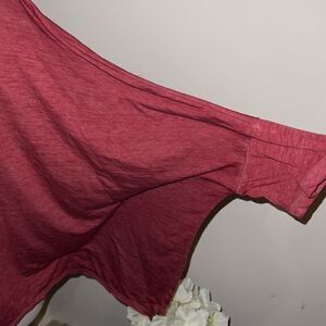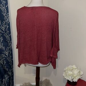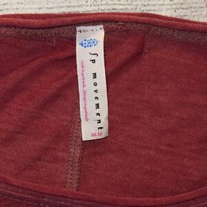 Good, preloved condition. Free People FP Movement Burn Baby Burn Cotton Blend 3/4 Sleeve Soft Tee. Burgundy red shade. Round neckline. 3/4 dolman sleeves. Soft and comfy. Pullover construction. Oversized, crop boxy.