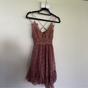 Free People Adella Lace Burnout Mini Dress, size XS in Ballet Mauve Pink. Velvety burnout lace enriches this slinky slipdress styled with a scalloped V-neck, a strappy back and a flouncy ruffle hem. Adjustable straps, fully lined. 70% viscose, 20% cotton, 10% nylon