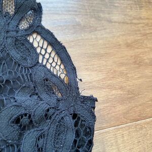 Free People FP One Adella Slip Mini Dress Black Ruffles Lace. Size S. 70% viscose, 20% cotton, 10% nylon. There is some wear and pilling to the fabric. There is a hole at one of the seams.