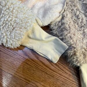 Cozy and unique Free People FP One zip-front jacket featuring a gorgeous mix of shaggy faux fur and soft textured fleece panels. Cream and tan tones with ribbed cuffs and hem. Fully lined and super comfortable. A standout layering piece with that signature Free People boho vibe.