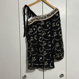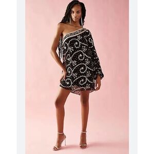 Shine bright in this so special mini dress featured in a one-shoulder silhouette and sequin-adorned fabrication with sheer overlay for added dimension at bottom.