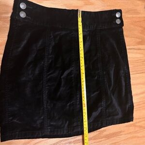 This is a Free People black velour velvet mini skirt in size 26 for women. The skirt features a solid pattern with button and zipper accents, a mid rise, and an A-line style. It is suitable for parties, casual wear, and the summer and spring seasons. The skirt is machine washable and made of cotton fabric. It is designed by Free People and made in Canada.