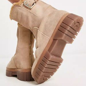So chic and perfect for chilly days, these built-for-the-elements boots are featured in a mid-calf height and pull-on style with cozy faux fur trim, an adjustable buckle closure, and chunky lug sole.