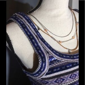 Fall = Sweater Weather. Wear this cobalt and purple Free People Fair Isle fit and flare sweater dress alone, under a blazer or bomber jacket, over bodysuit or leggings. Wool blend. Raw hem edging