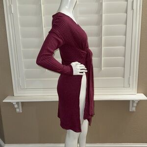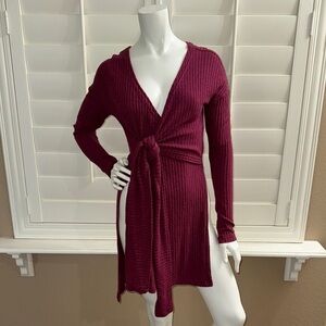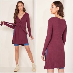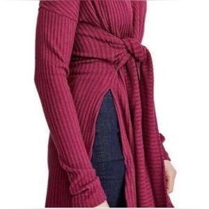 A stylish longline top features a flattering waist tie accent and ribbed knit construction.
